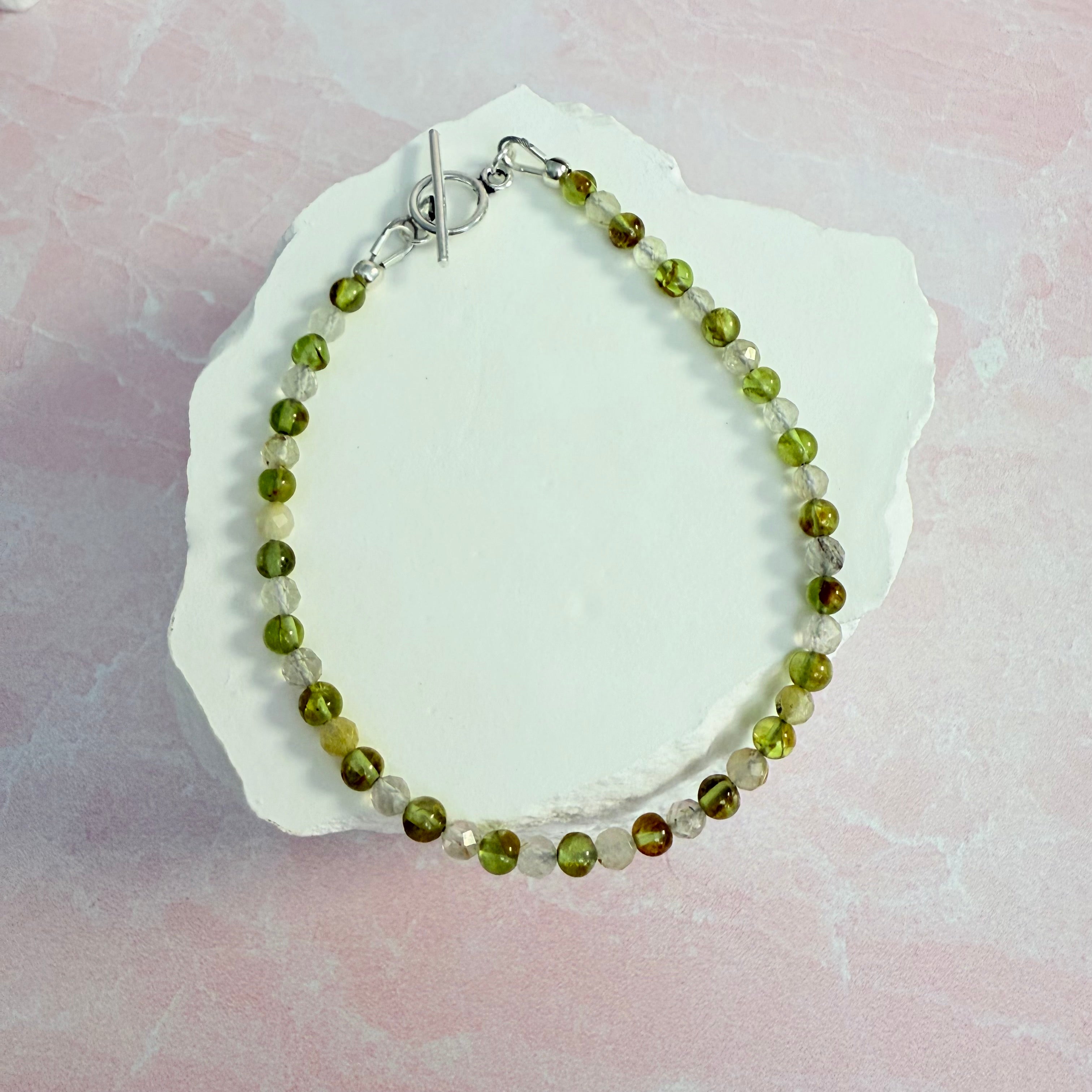 Regular price 46.00Sale price 46.00 Regular priceUnit price / perThis 7.5-inch bracelet features a harmonious blend of round peridot and faceted golden quartz beads, secured with a sterling silver toggle clasp. The combination of vibrant...