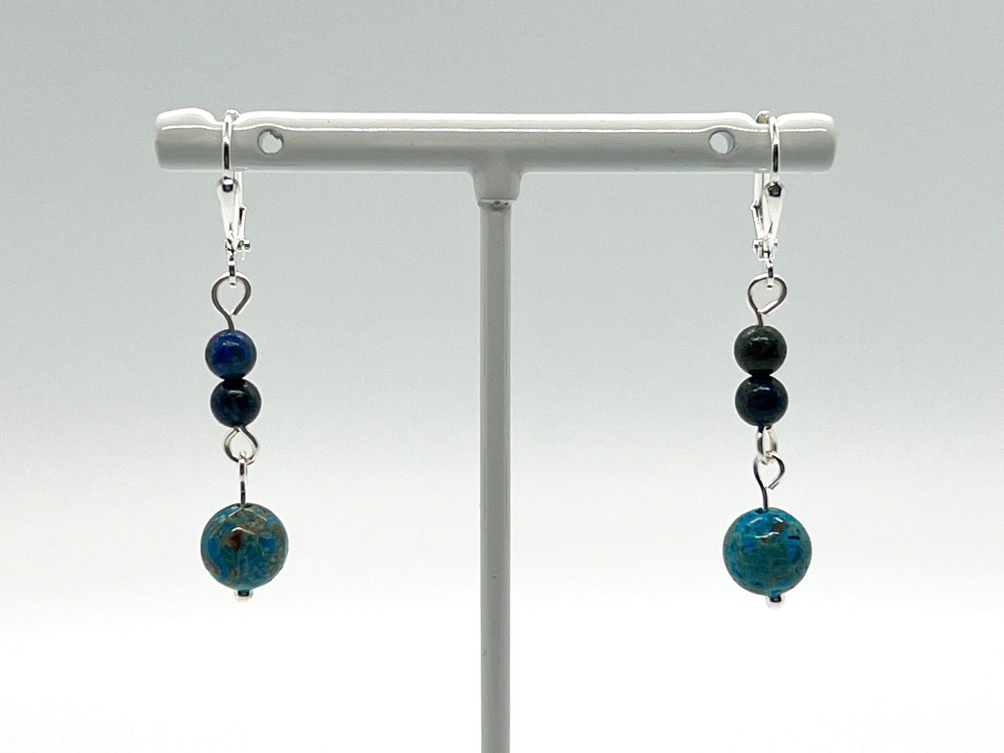 Regular price 11.99Sale price 11.99 Regular priceUnit price / perThese earrings have blue Agate beads with smaller Azurite & Malachite beads on a silver plated ear hook clasp.