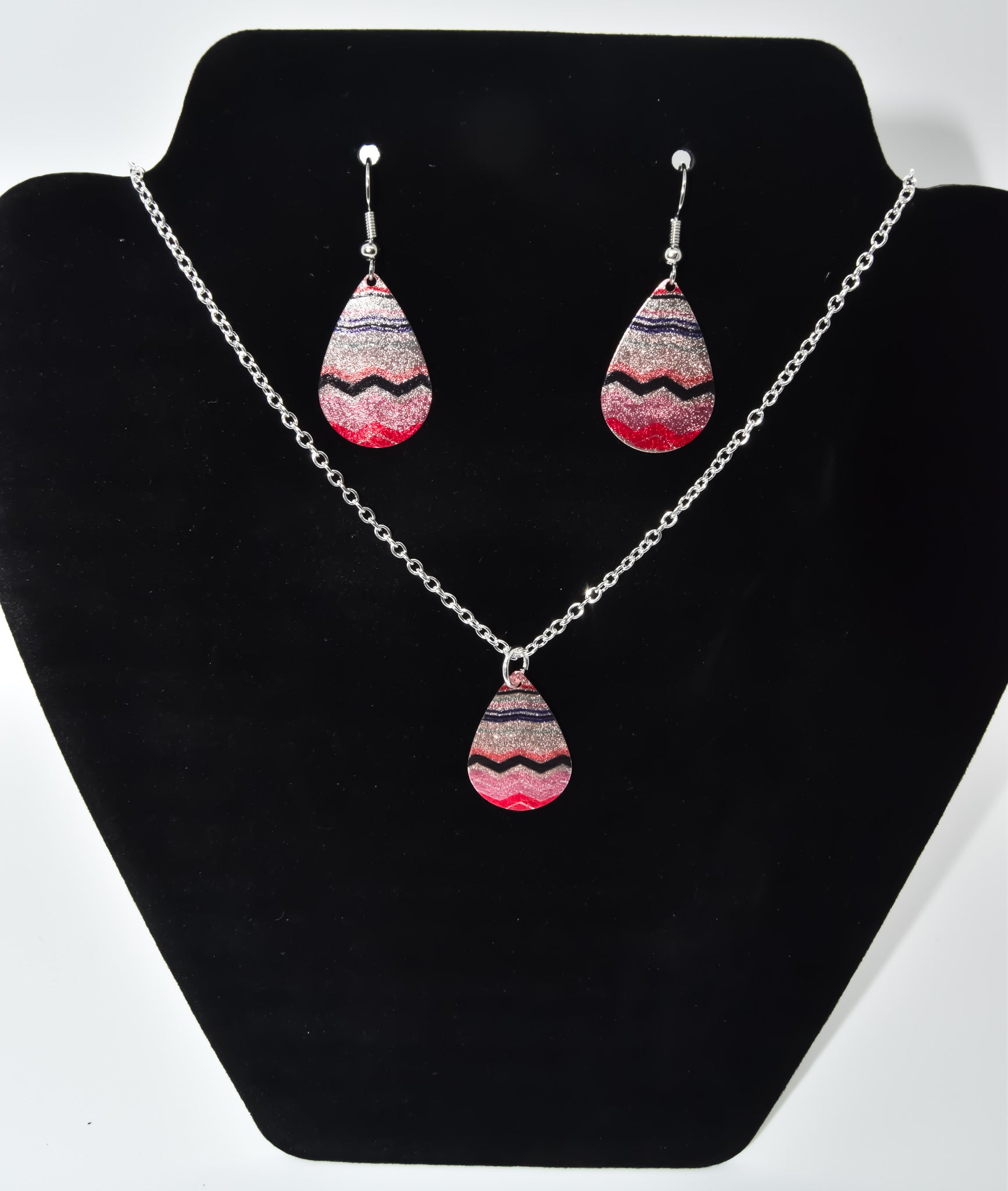 Regular price 15.99Sale price 15.99 Regular priceUnit price / perThis sediment etched teardrop pendant and matching earrings use rose gold plated metal for the design. The chain and earring hooks are silver plated. The multiple...