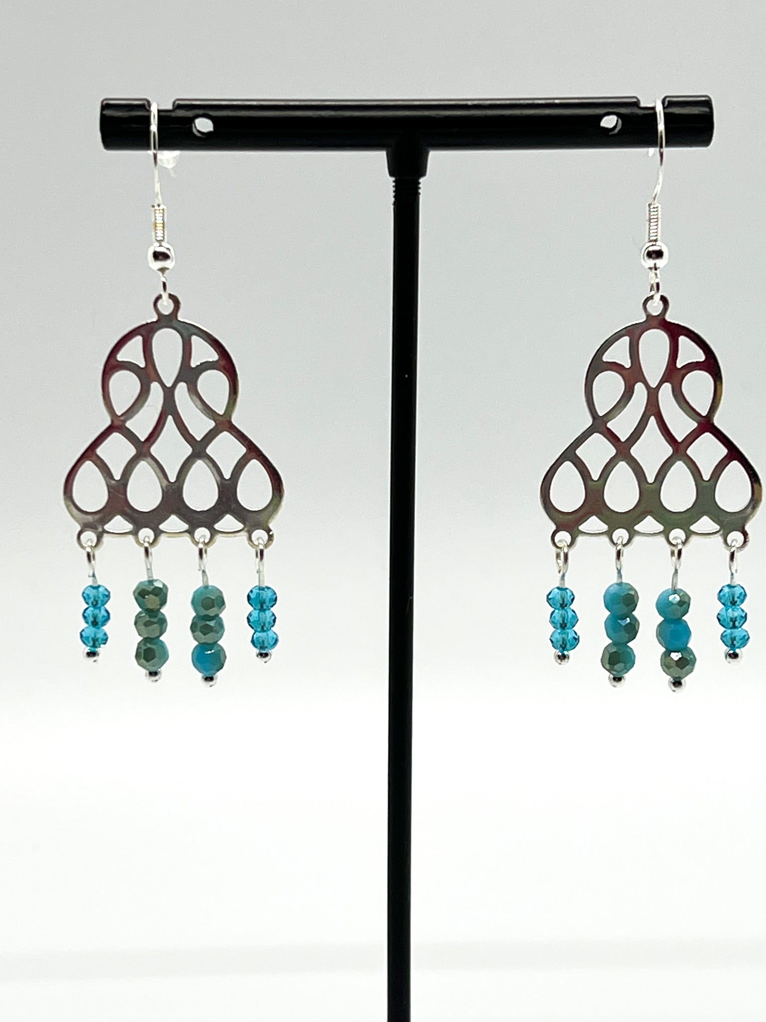 Regular price 16.99Sale price 16.99 Regular priceUnit price / perThese chandelier earrings pop with the teal and aqua faceted glass beads. The chandelier frame is pewter and the ear hooks are sterling silver.