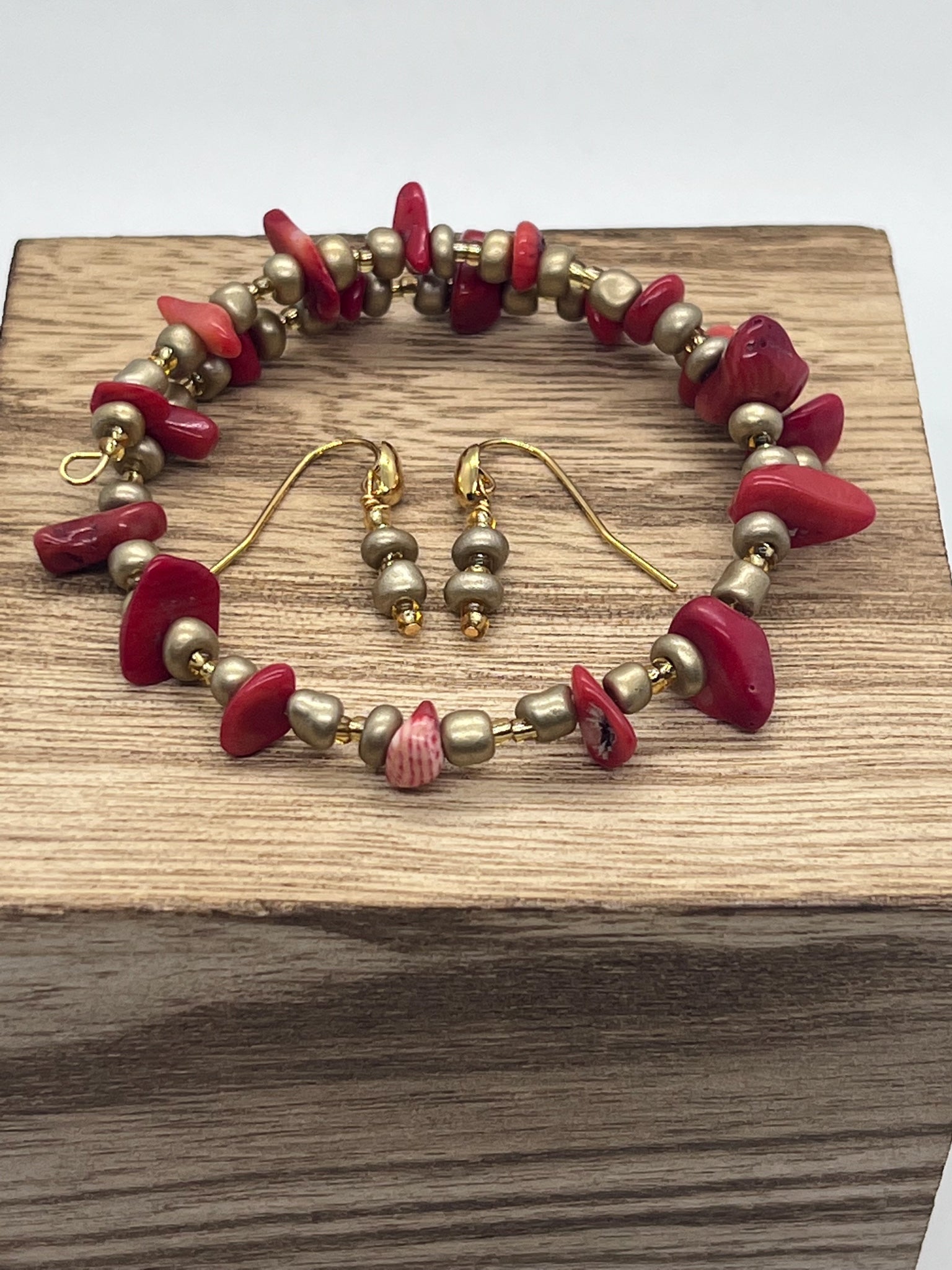 Regular price 19.99Sale price 19.99 Regular priceUnit price / perThis bracelet and earring set has red bamboo coral chips with 2 different styles of gold glass beads. The bracelet is made with memory wire making...