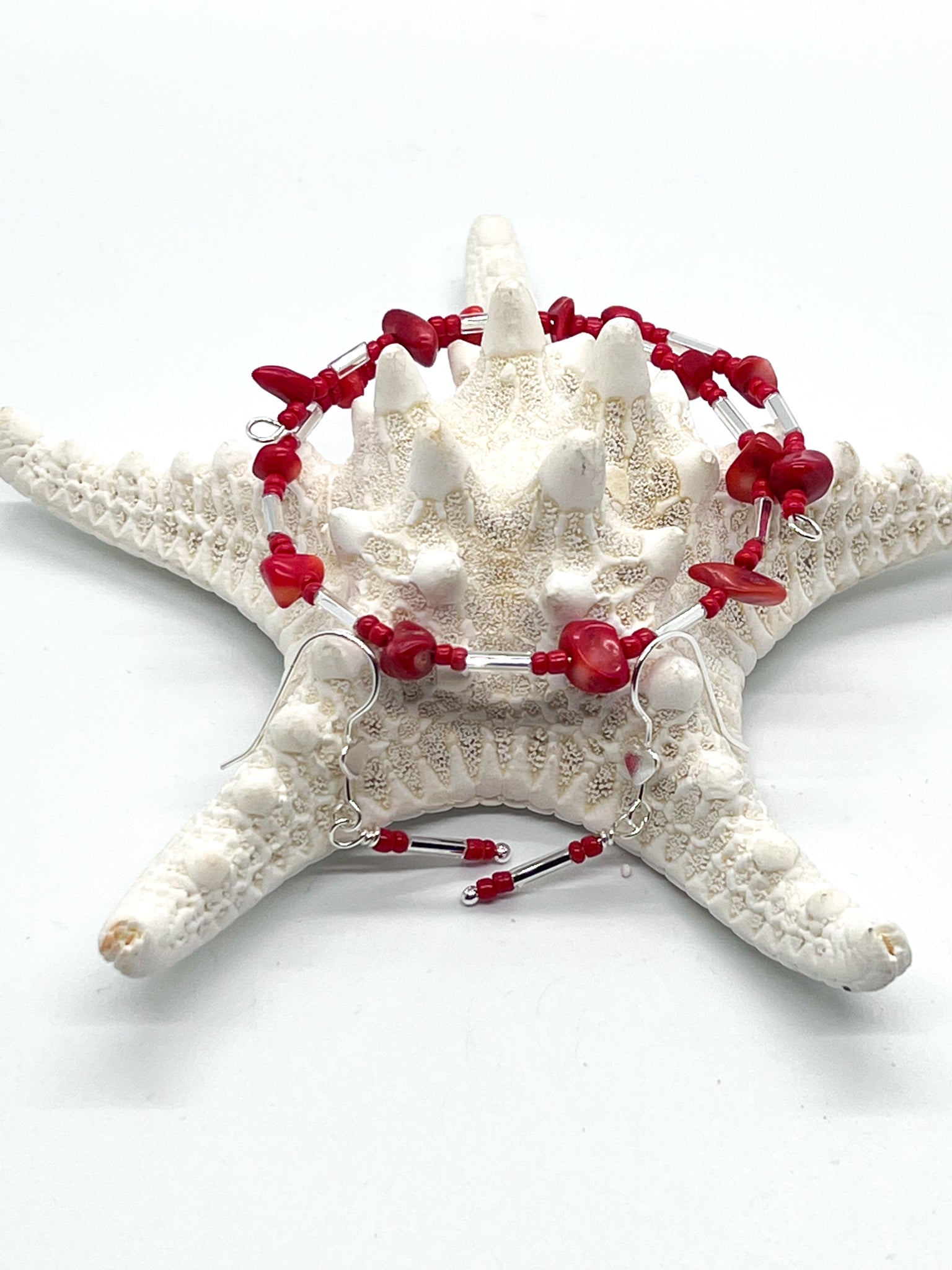 Red Bamboo Coral Bracelet & Earrings in Silver