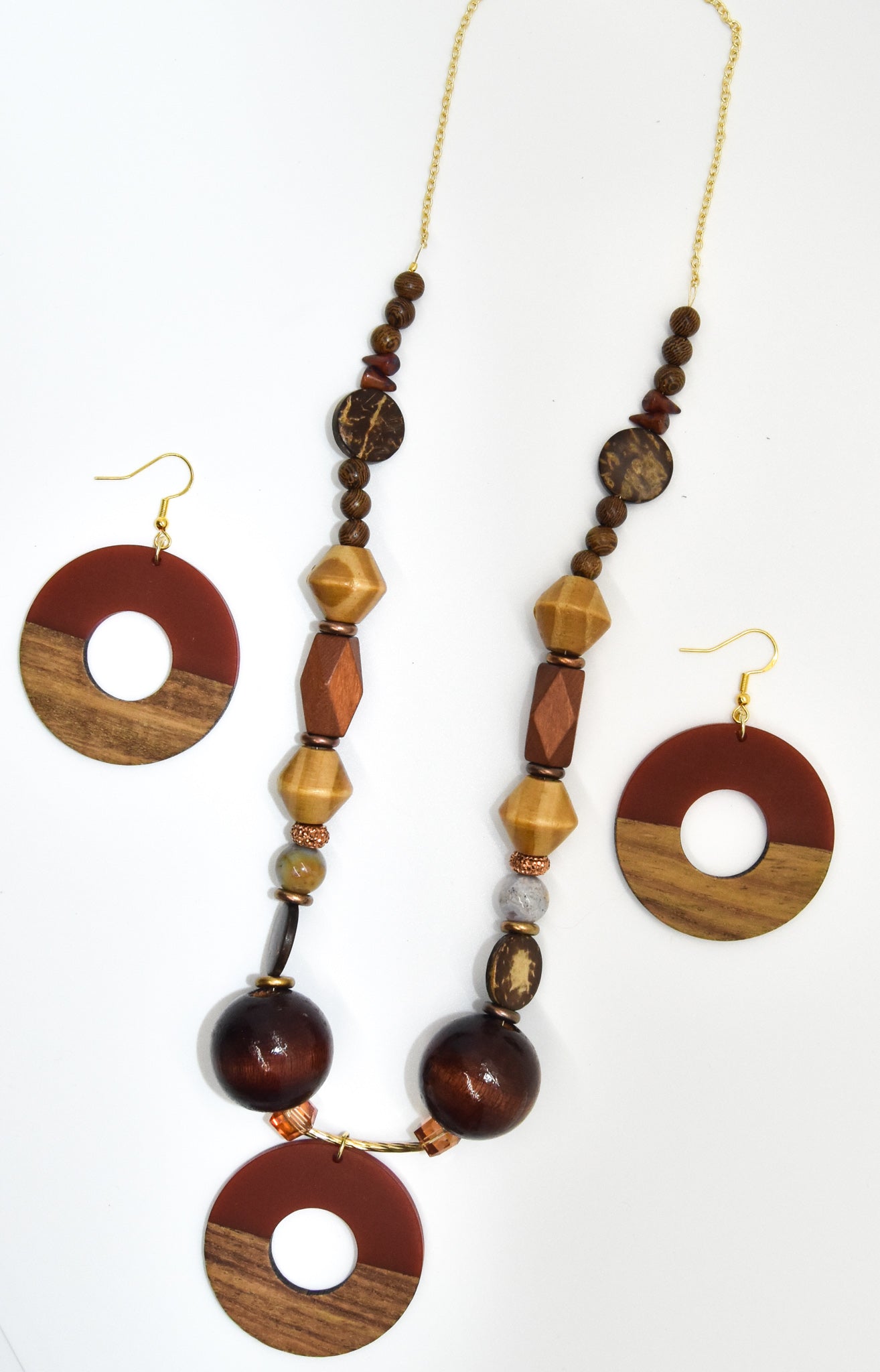 Wood Crystal & Resin Necklace + Earrings