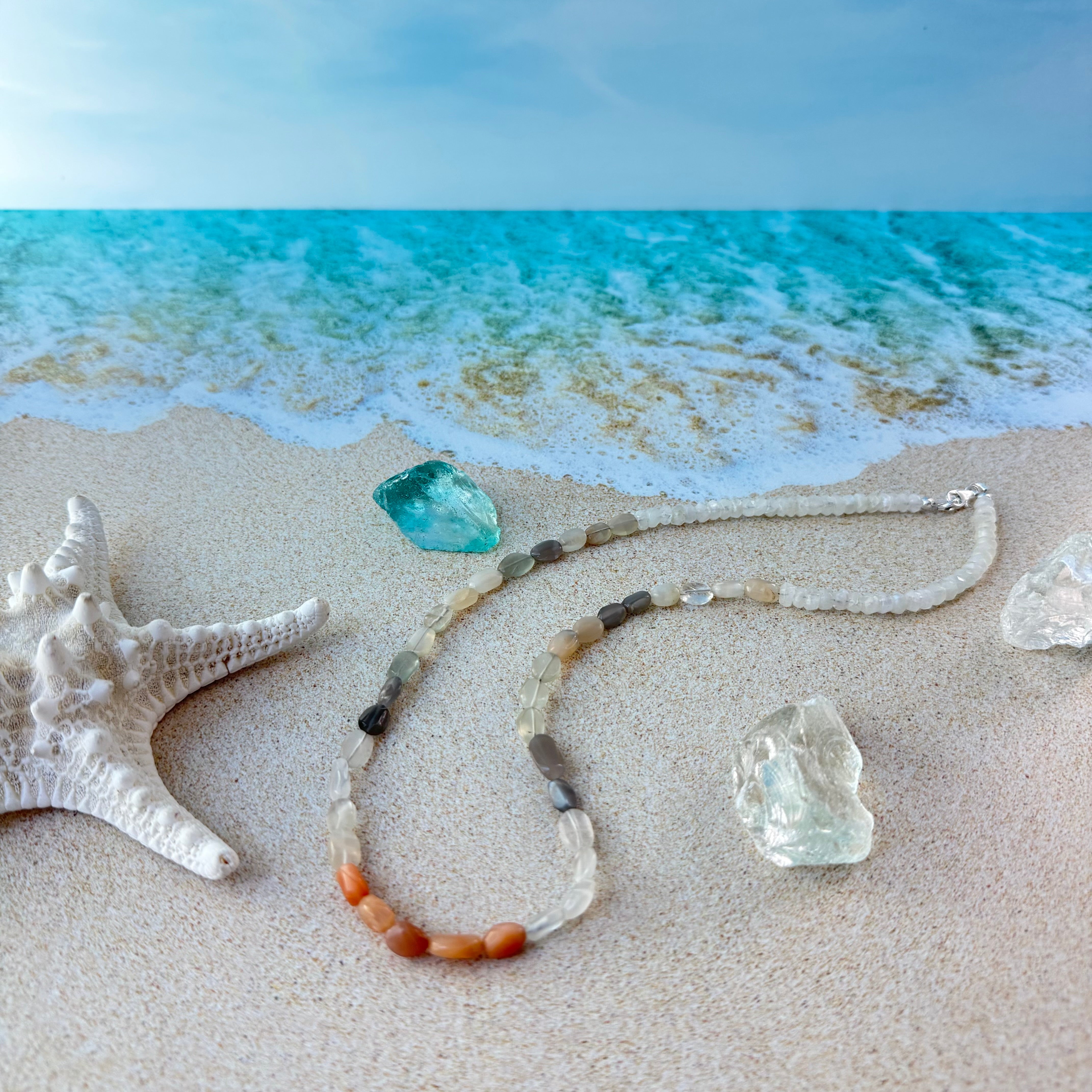 Regular price 68.00Sale price 68.00 Regular priceUnit price / perExpertly crafted 22.5" necklace featuring luminous rainbow moonstone in two distinct forms: faceted beads that capture and refract light, and elegant oval puff beads that showcase...