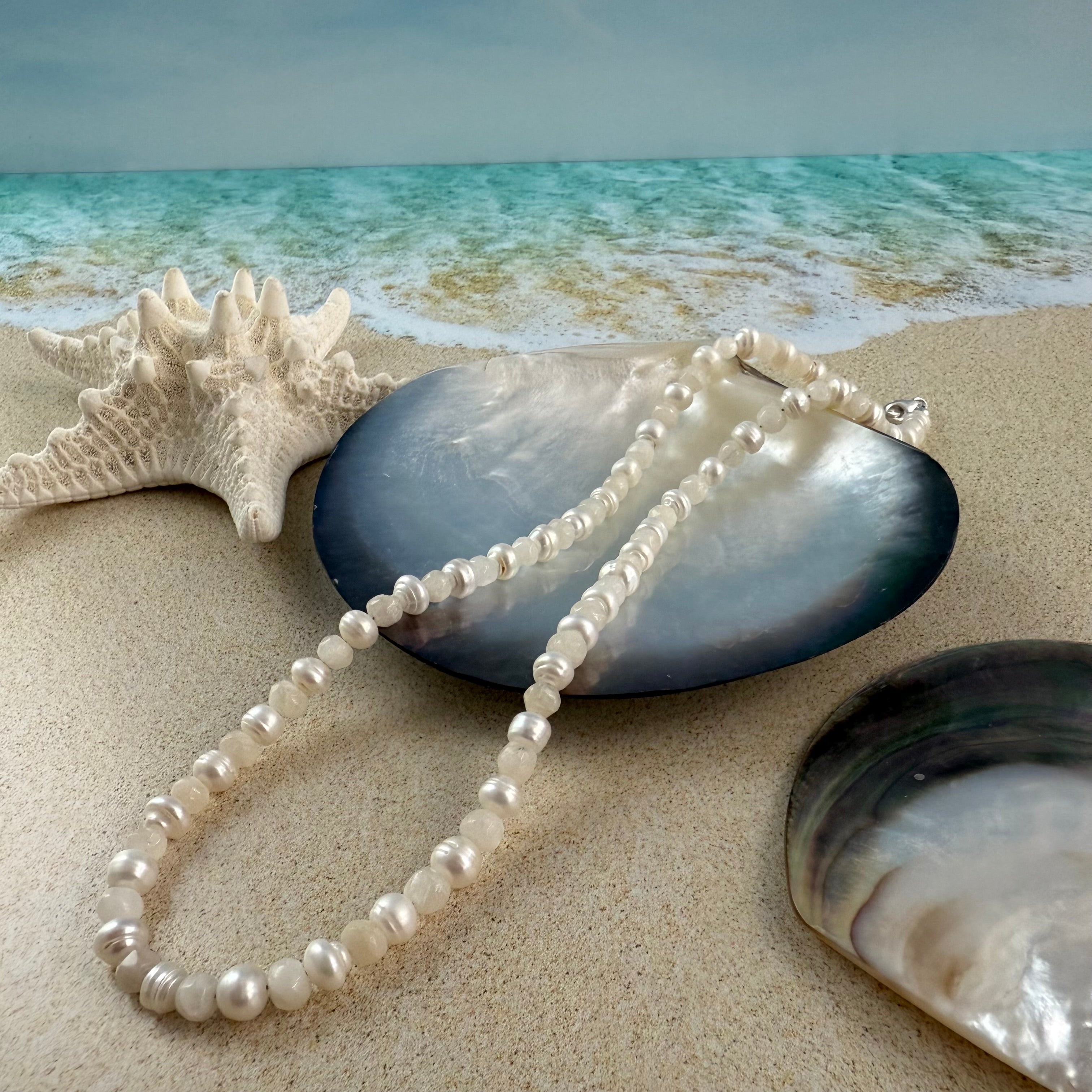 Introducing our exquisite June Birthstone Collection, a celebration of timeless elegance and the enchanting allure of June's birthstones—pearls and moonstone. This collection beautifully combines the natural beauty of these two gemstones, offering pieces that exude sophistication and grace. All components of these necklaces, bracelets and earrings are either gold filled or sterling silver, offering elegance no matter which piece you choose.