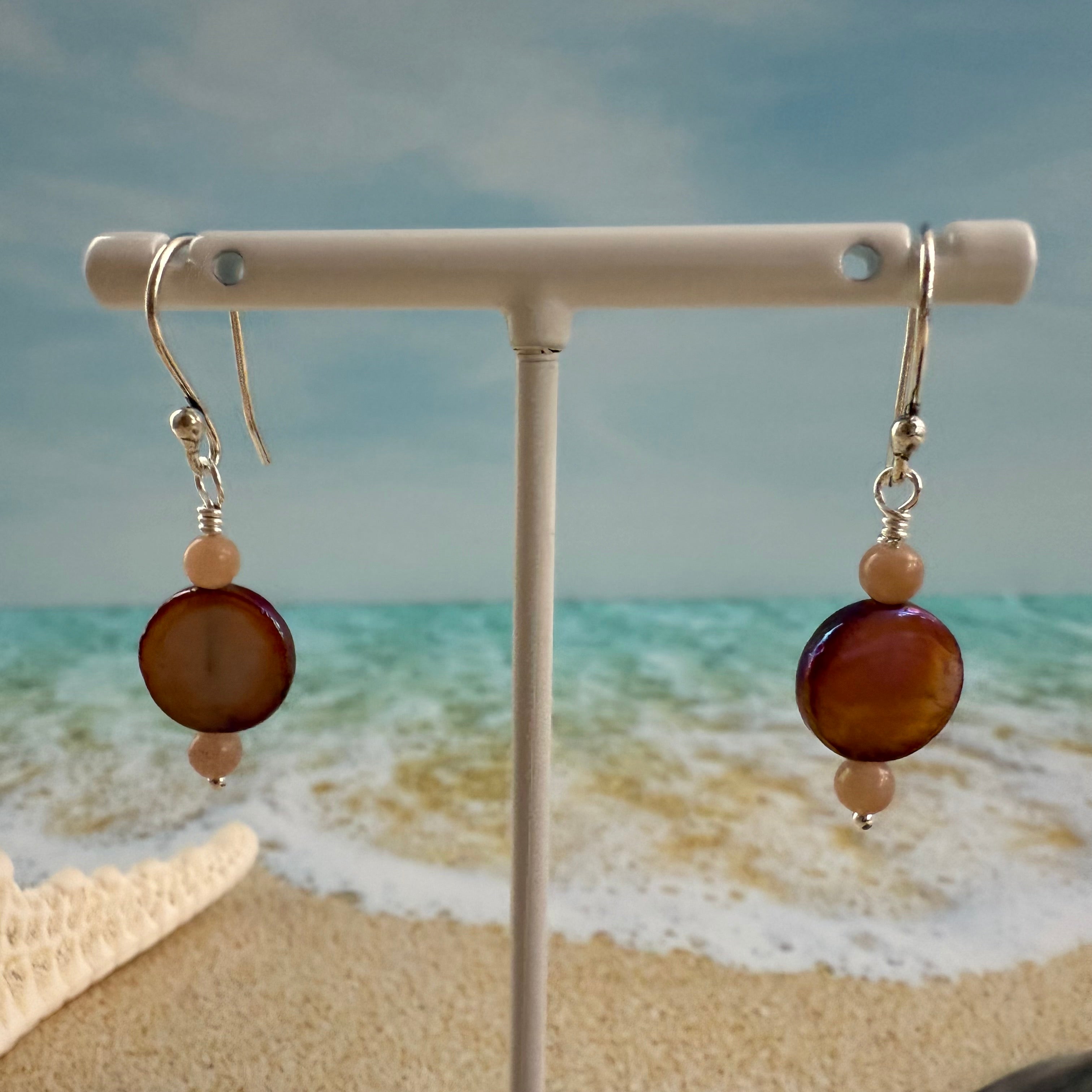 Regular price 27.00Sale price 27.00 Regular priceUnit price / perElegantly crafted 1.5" earrings featuring luminous round peach moonstone beads paired with flat round mother of pearl elements. The sterling silver ear hooks ensure both durability...