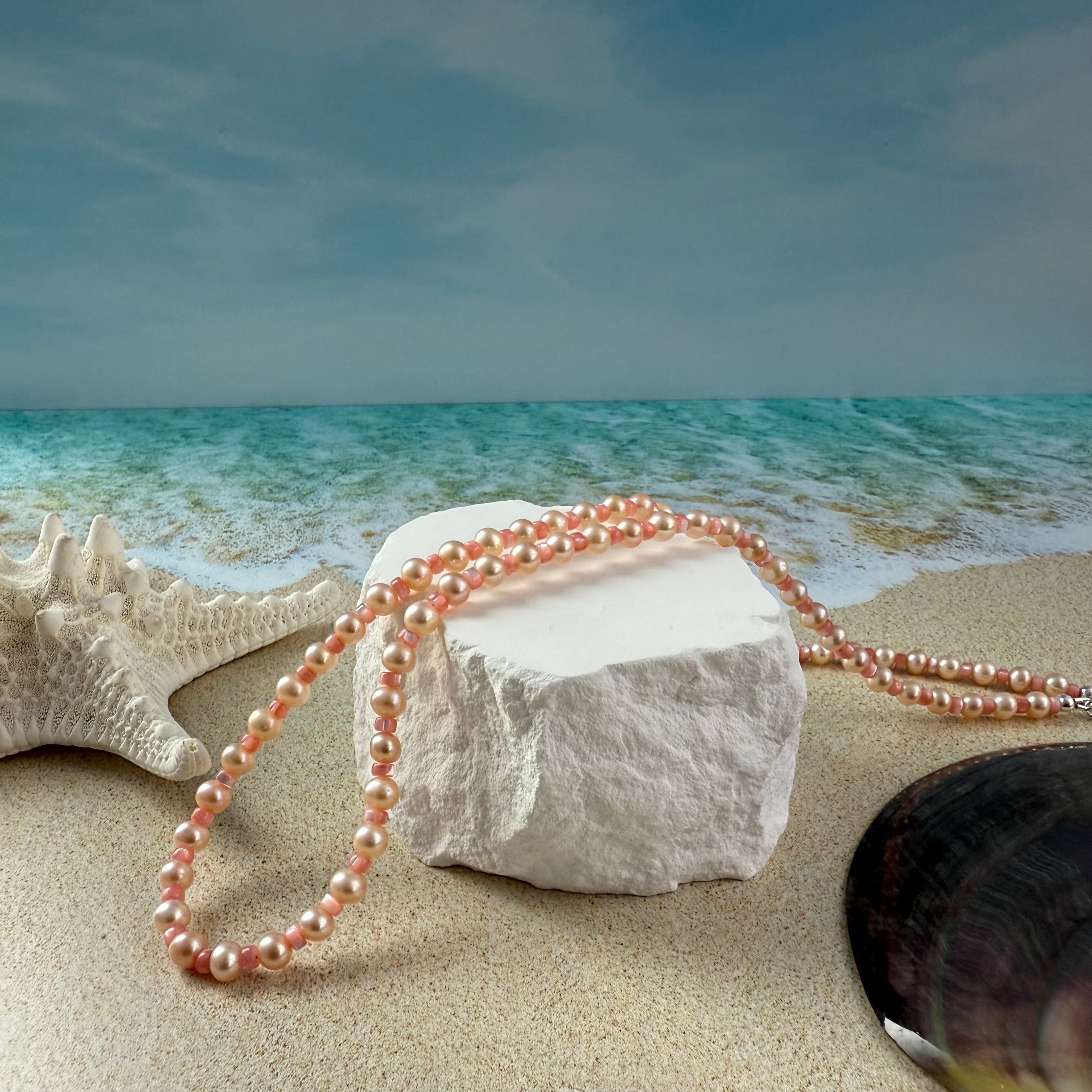 Regular price 57.00Sale price 57.00 Regular priceUnit price / perThis elegant 21" necklace features lustrous peach cultured pearls alternating with delicate cherry blossom mother of pearl Heishi beads. The composition creates a sophisticated interplay of...