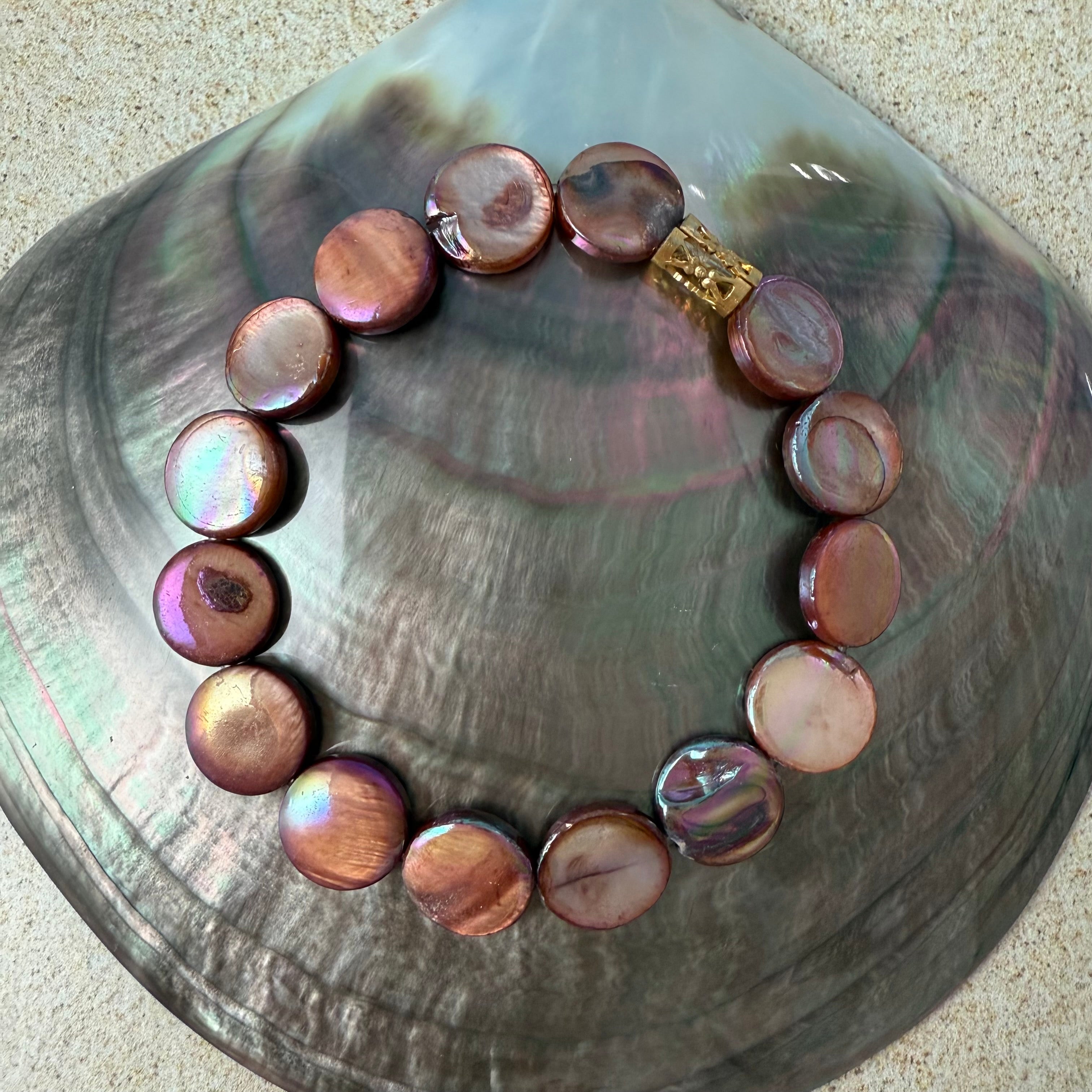Regular price 41.00Sale price 41.00 Regular priceUnit price / perThis expertly crafted 8" bracelet features luminous peach moonstone beads complemented by rich terra cotta mother of pearl elements. The sterling silver toggle clasp provides both...
