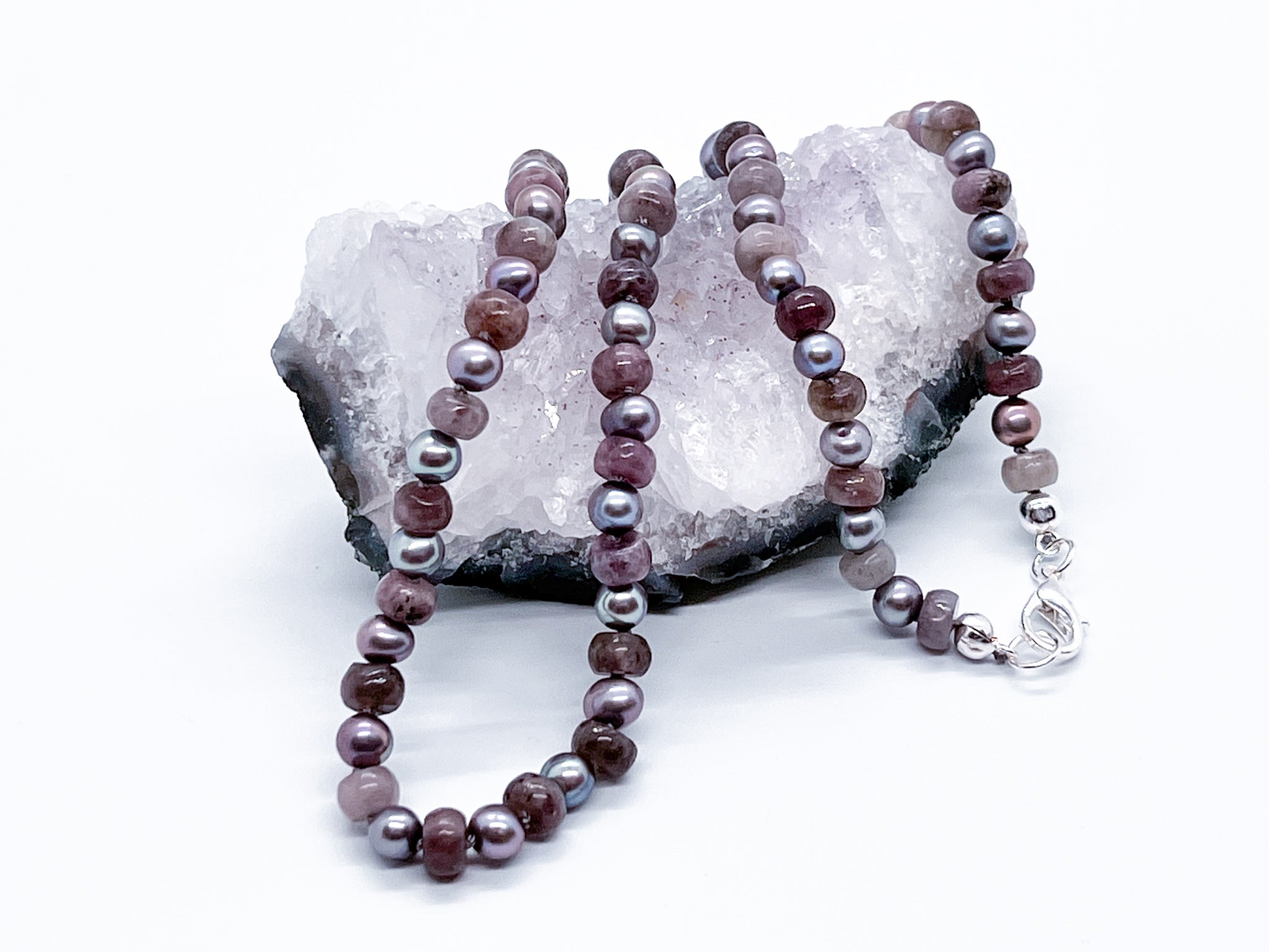 Regular price 99.00Sale price 99.00 Regular priceUnit price / perThis necklace is truly a work of art. Each stone and pearl are individually knotted to provide protection for the beads. The technique of knotting provides...