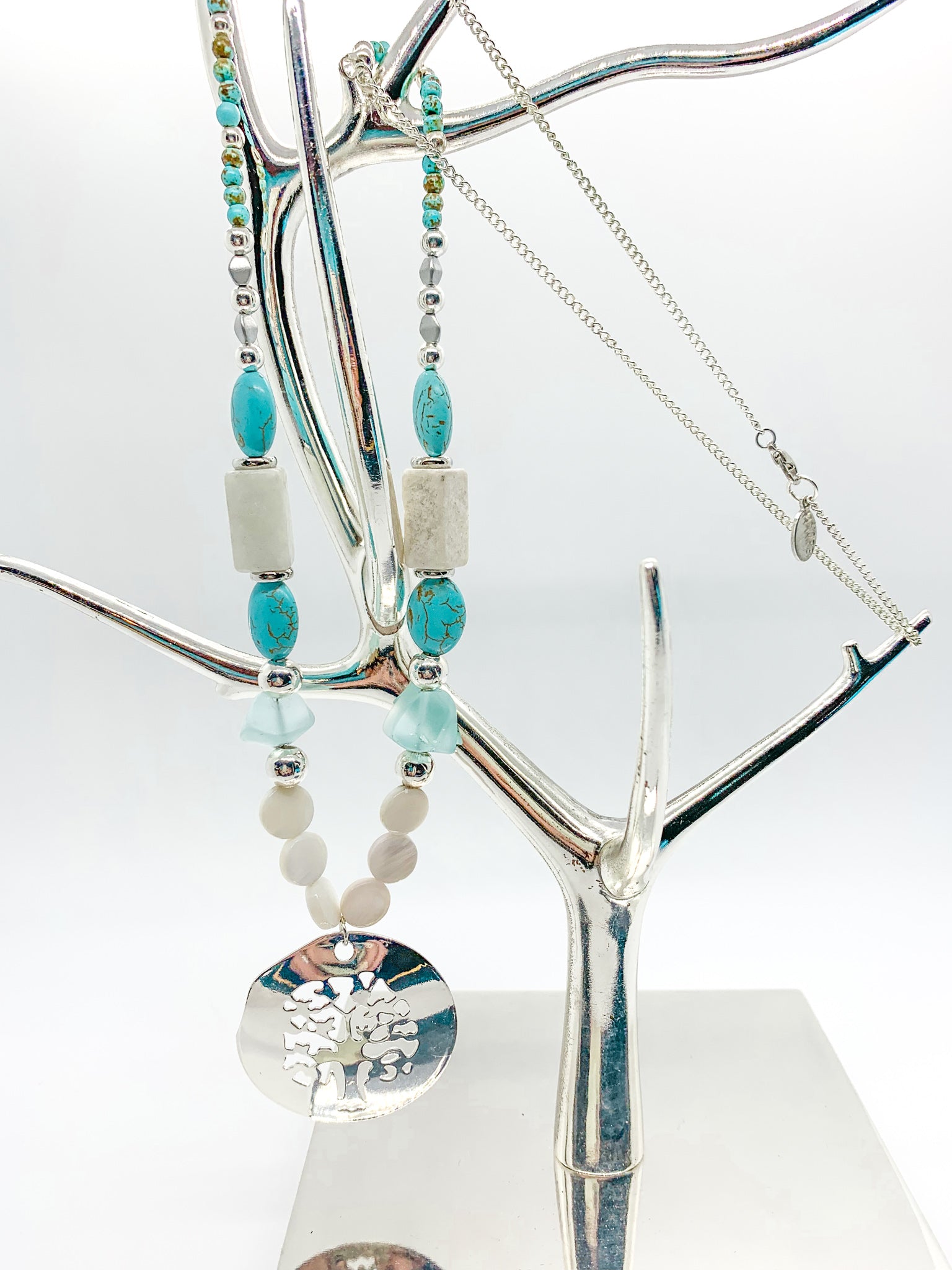 Regular price 54.99Sale price 54.99 Regular priceUnit price / perThe signature piece of our Summer of Hope Collection is our Tree of Hope 30" necklace. We combined several different silver plated elements with Magnesite, Amazonite...