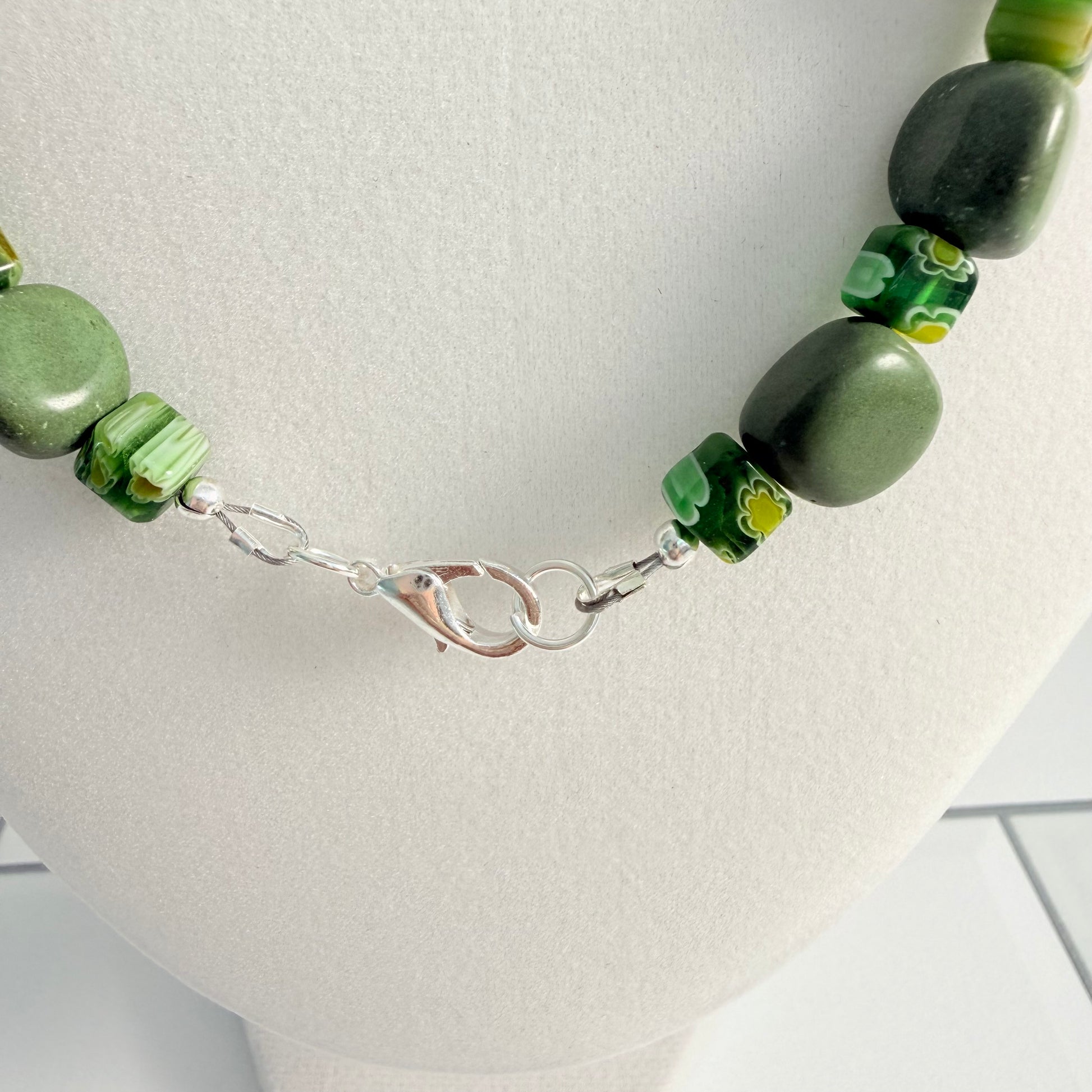 In this workshop we will be making a 19.5-20" necklace using green Serpentine & Millefiori beads. The clasp is a stainless steel lobster clasp. All other components are silver plated. This necklace pairs lovely with our Millefiori Earrings workshop that happened earlier this month. All supplies and tools will be provided.