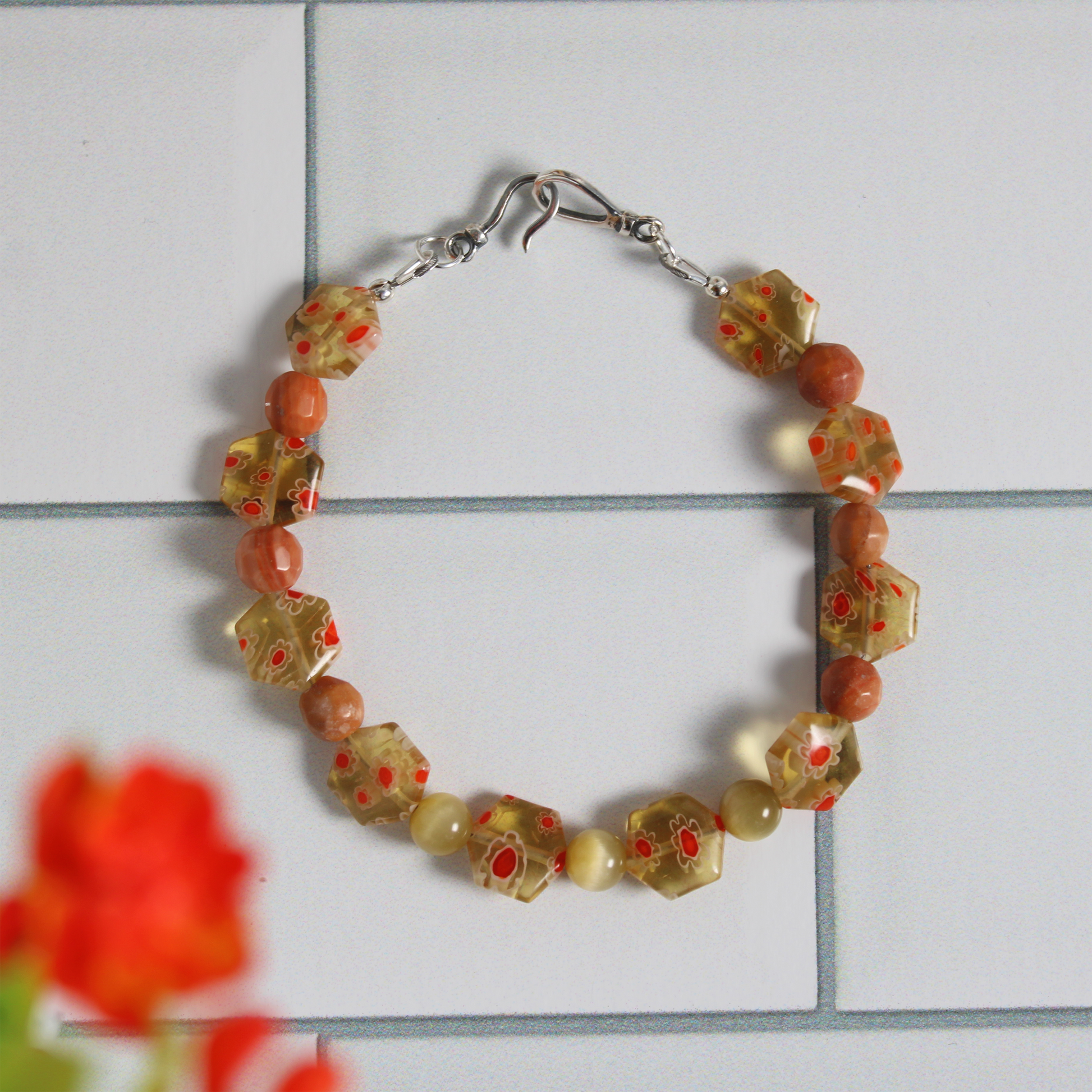 Tie your Spring Awakening look together with the Eye on Millefiori Bracelet, a cheerful blend of color and warmth. Smooth red onyx marble beads add rich, earthy depth, while hexagon Millefiori beads bring playful pops of floral pattern to the design. Honey tiger eye beads introduce a soft golden glow that catches the light with every movement. Finished with a sterling silver hook-and-eye clasp for secure, easy wear, this 7.75" bracelet is perfect on its own or stacked, and pairs beautifully with the Eye on Millefiori necklace and earrings for a fully coordinated, artful set.