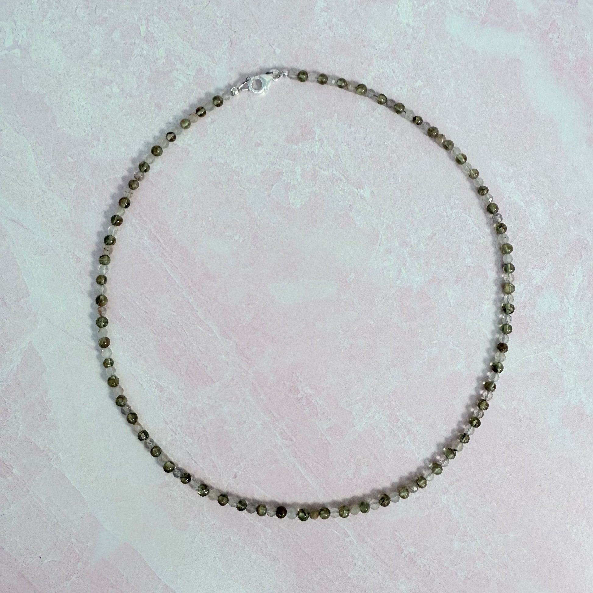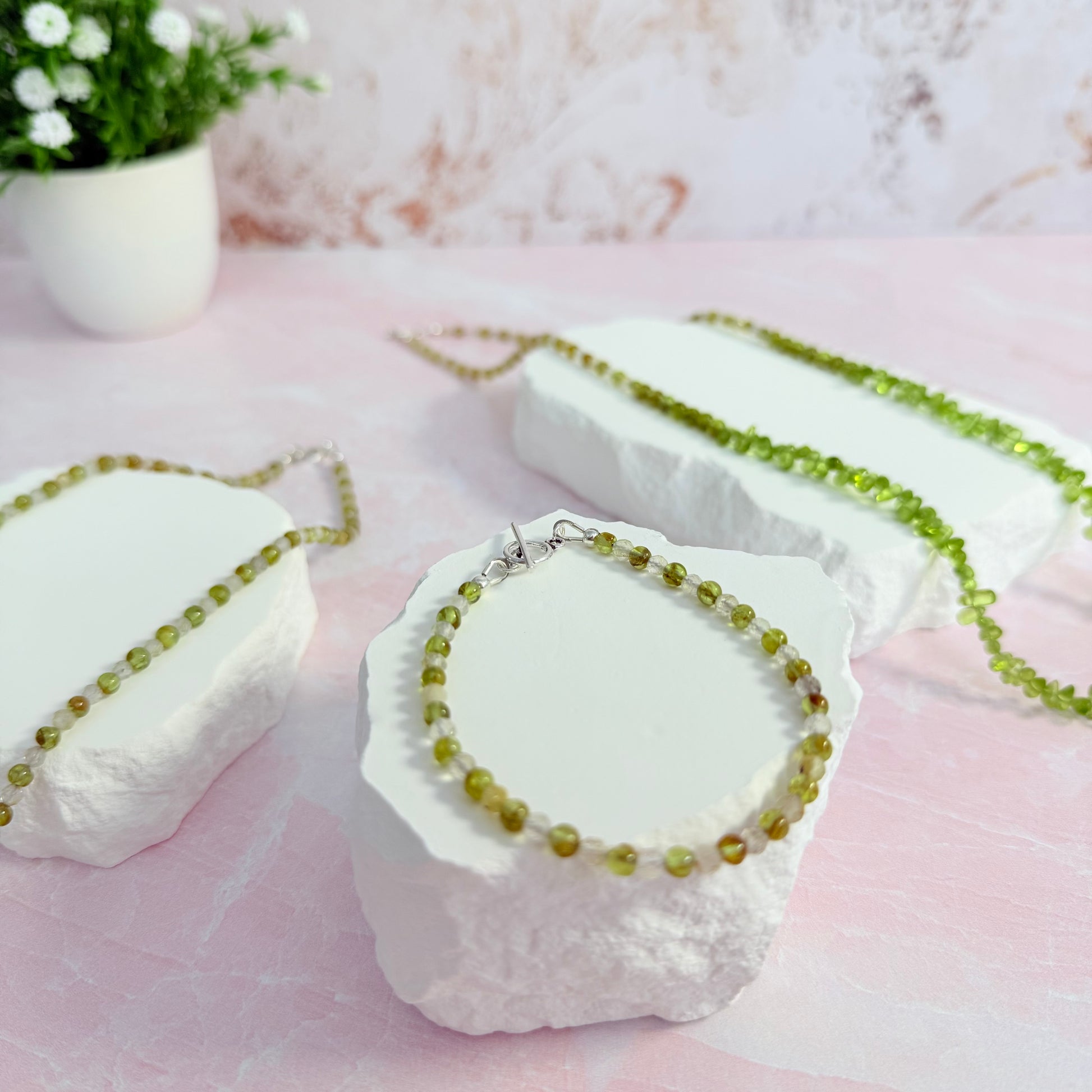 Elevate your elegance with this 18" necklace featuring luminous round peridot stones paired with sparkling faceted golden quartz. The sterling silver clasp ensures a secure and refined finish, making it a timeless accessory for any sophisticated ensemble.