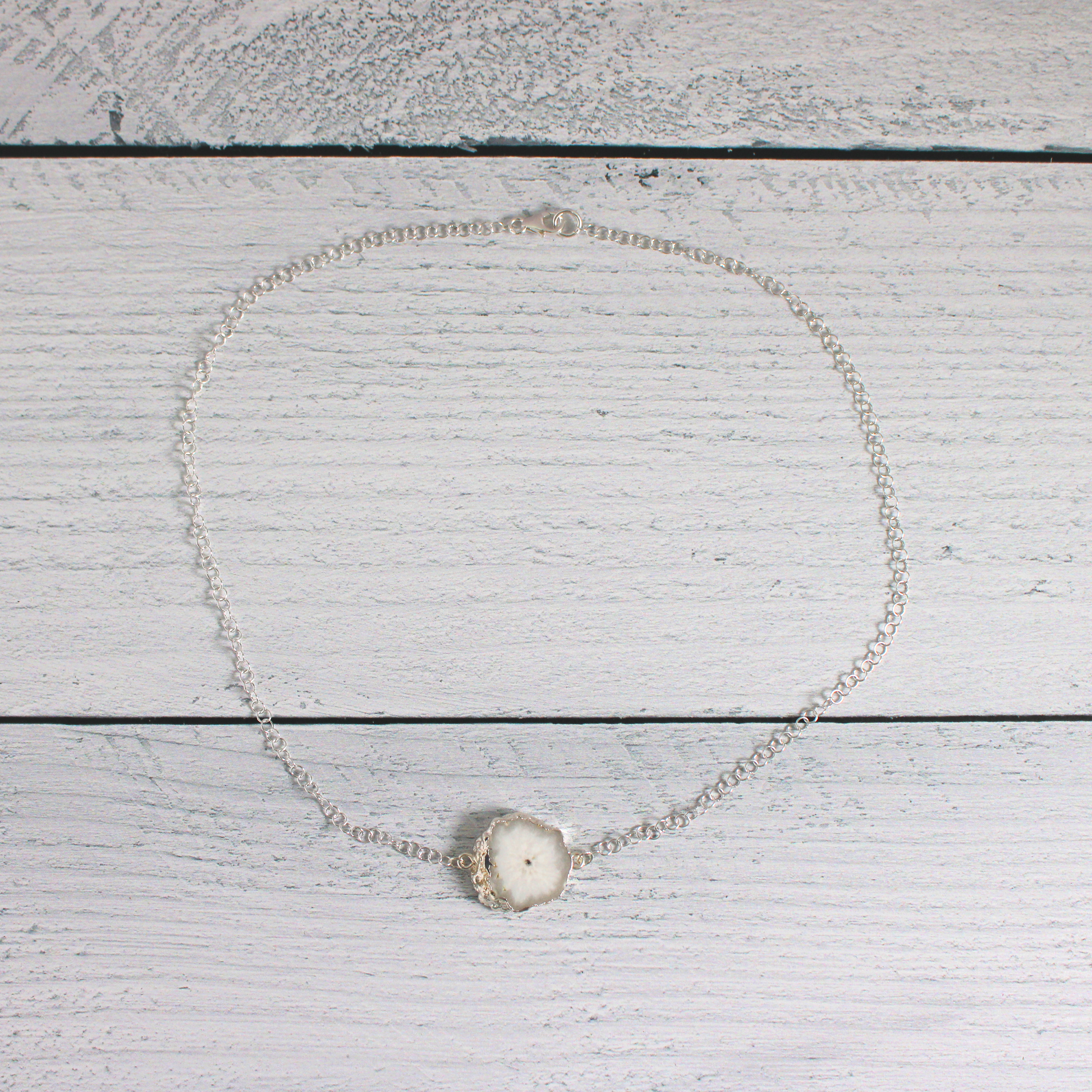 Hang tight—this geological beauty is about to become your new favorite accessory! Our quartz stalactite slice pendant gleams with a lustrous silver finish, suspended from a genuine sterling silver chain that's as reliable as it is elegant. At 20 inches, it hits that sweet spot for layering or wearing solo. Whether you're a crystal enthusiast, geology buff, or just someone who appreciates nature's artistry, this necklace brings a touch of underground magic to your everyday style. A conversation starter that actually has a story to tell.