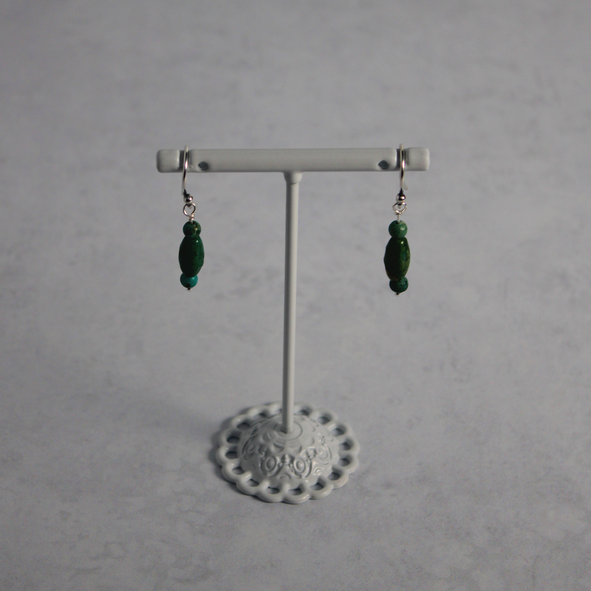 Dangle into tranquility with these charming turquoise earrings! Featuring a delightful mix of oval and round turquoise beads strung on sterling silver ear wires, these 1.75" beauties strike the perfect balance between understated elegance and eye-catching color. Light enough for all-day wear, they're your go-to accessory for adding a pop of peaceful vibes to any outfit. Simple, stunning, and oh-so-wearable.