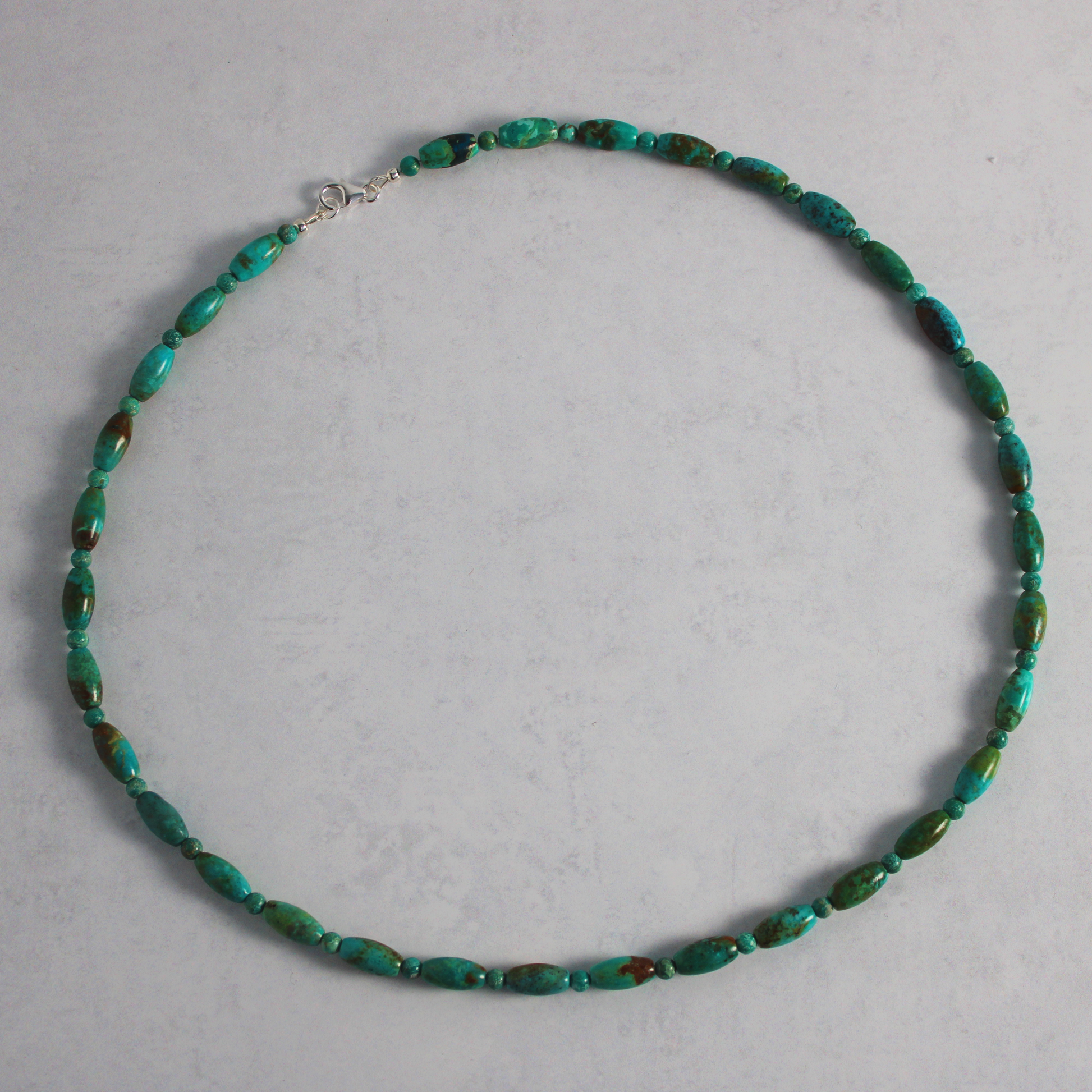 Dive into effortless elegance with this charming turquoise necklace! Strung at a perfect 22 inches, it features a delightful mix of oval turquoise tube beads and round turquoise stones that catch the light beautifully. Finished with a sterling silver clasp, this piece is as reliable as it is gorgeous. Whether you're layering it with other favorites or letting it shine solo, this necklace brings a pop of color and a touch of whimsy to any outfit. Simple, stunning, and totally wearable.