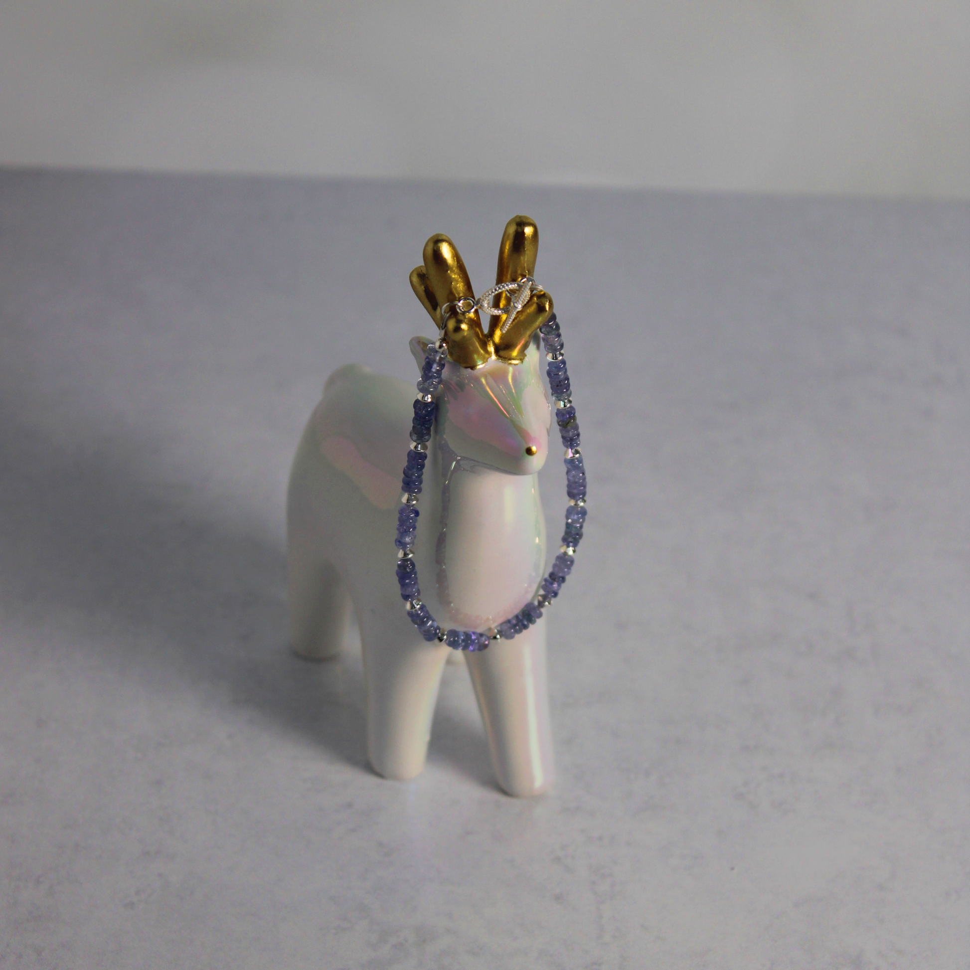 Sparkle on your wrist with this charming 7.5" bracelet featuring gorgeous small rondelle Tanzanite stones that catch the light beautifully. Delicate sterling silver bicone beads add a touch of elegance between groups of stones, while a sturdy sterling silver ribbed toggle clasp keeps everything secure. Perfect for layering or wearing solo, this playful piece brings a pop of color and sophistication to any outfit. A little luxury that will make you fee regal.